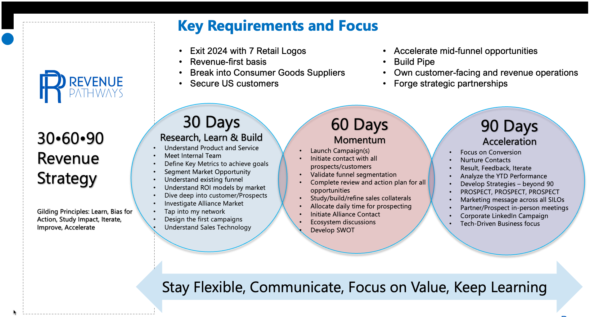 In the dynamic realm of startups, the role of a Fractional Chief Revenue Officer (CRO) and implementing a 30-60-90 day plan are indispensable. These plans serve as strategic roadmaps, guiding the organization through crucial stages of growth and transformation. By immersing themselves in the startup's ecosystem and gaining deep insights into its challenges and opportunities, Fractional CROs can swiftly identify key areas for improvement and drive targeted initiatives aimed at maximizing revenue streams and market reach. This structured approach not only fosters agility and innovation but also instills confidence in the organization's growth trajectory. By leveraging data-driven insights and fostering collaboration across teams, Fractional CROs empower startup retailers to navigate market complexities, capitalize on emerging opportunities, and achieve sustainable long-term success in a competitive landscape.